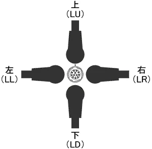 L型コネクタで他の方向をご希望の場合は、型番内の(LD)を上出し(LU)、右出し(LR)、左出し(LL)に変更して下さい。