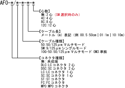 | AFO-SC/SC-10G-50-10-4C | ファンアウトケーブル 4心 SC/SC 50/125μm OM3準拠 10m | |