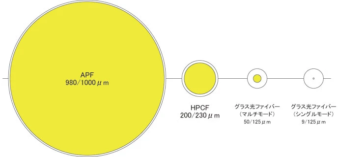 プラスチック光ファイバー(APF、HPCF)は、グラス光ファイバーに比べコア部が大口径なので光源との結合やファイバー間の接続の際に高い位置決め精度を要求されません。