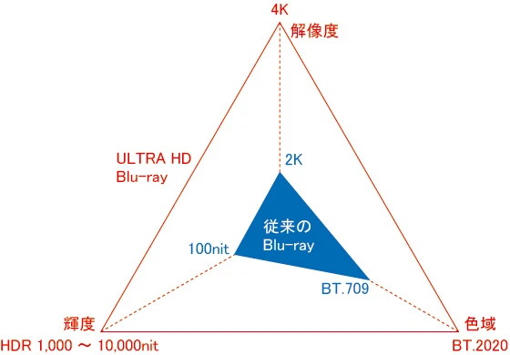 参考:Blu-rayとULTRA HD Blu-rayの解像度、輝度、色域比較図