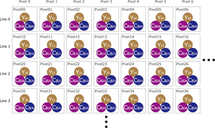 YCbCr 4:4:4 における有効ピクセル(画面)内の構成イメージは下図のようになり、全てのピクセルにそれぞれルマ(Y)と各クロマ(Cb、Cr)が存在する。