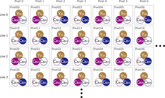 YCbCr 4:2:2 における有効ピクセル(画面)内の構成イメージは下図のようになり、全てのピクセルにルマ(Y)が存在し、平行方向に並ぶ2つのピクセルでは、各クロマ(Cb、Cr)がシェアされる。YCbCr 4:4:4 と比較して情報量が2/3となる。