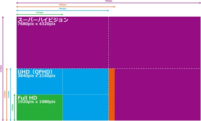 | スーパーハイビジョン | 7680×4320 | 33.2メガピクセル(3317万7600画素) |