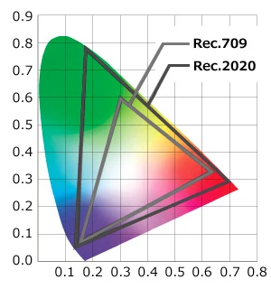 4K/8K放送で標準化されているBT.2020(Rec.2020)は、従来のフルハイビジョン放送で用いられるBT.709(Rec.709)よりも大幅に広い色域をカバーしている。