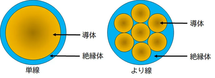メタルケーブルの基本は、電気の流れる「導体」と、電気が外へ漏れるのを防ぐための「絶縁体」にて構成されています。絶縁体内の導体が1本のものを「単線」、導体が複数本より合わされているものを「より線」と呼びます。