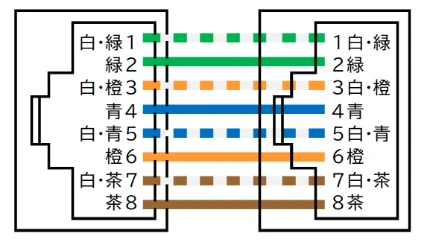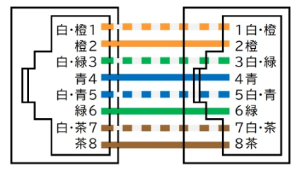 この中でT568AをA結線と呼び、T568BをB結線と呼んでいます。