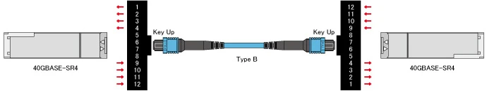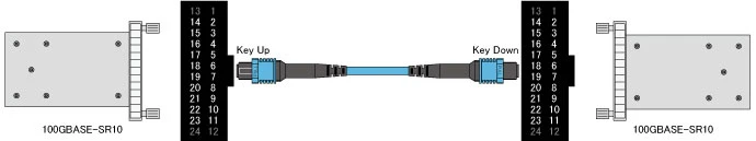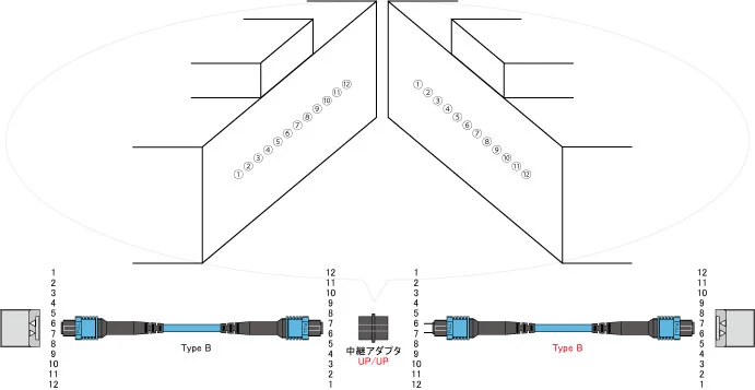 40GBASE-SR4 QSFP+トランシーバ間や100GBASE-SR4 QSFP28トランシーバ間をMPOケーブルで直接接続する場合、通常はType-Bケーブルで接続しますが、ネットワークの変更によって既存のケーブルをさらに延長して接続させたい場合があります。