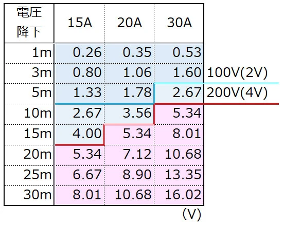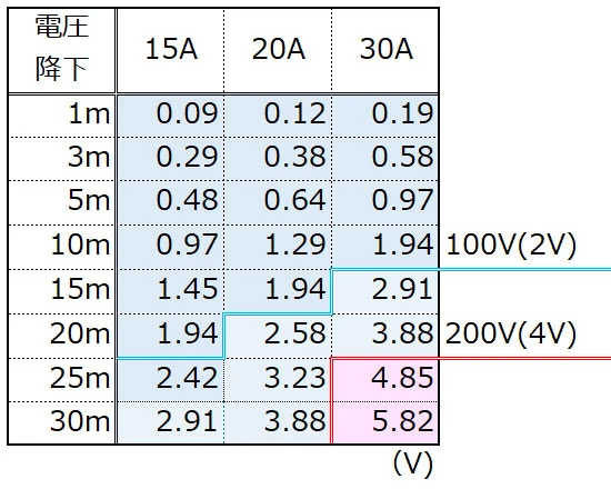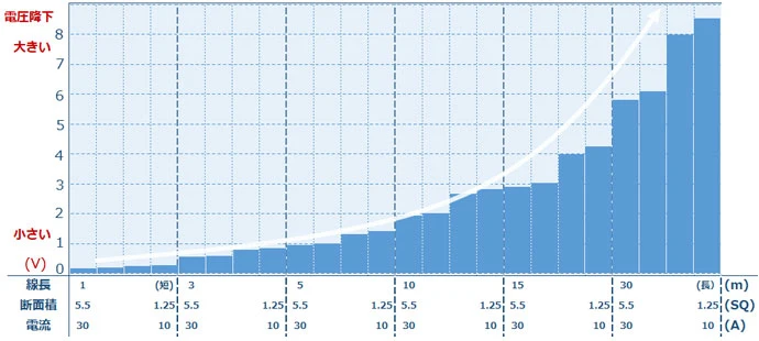 電圧降下は、電線が細いほど、または電線が長いほど、使用電流が多いほど大きくなります。